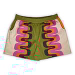 Meander is a 70s supergraphic inspired curving river print down the leg in royal fuchsia pink, safety orange, and charcoal orange with a split background of khaki beige near the pocket and olive green in the middle crotch. Right pocket is lined with olive green, left pocket is safety orange.