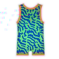 "Circuit Breaker" graphic spandex singlet. An all-over zig-zag marker pattern in blue with green background with black speckles, with tangerine orange trim.